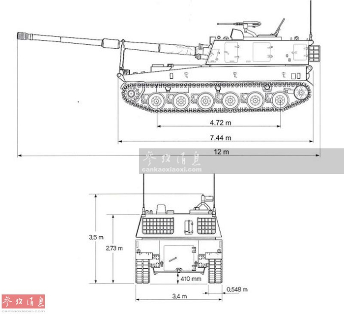 K-9自行火炮全长12米(含主炮),全宽3.4米,全高2.73米,战斗全重46.3吨。炮塔和车体为钢装甲全焊接结构,最大装甲厚度为19毫米,可防中口径轻武器火力和155毫米榴弹破片。乘员组为5人,即1名驾驶员和战斗乘员舱内的4名乘员(车长、炮长、炮长助手和装填手)。 图为K-9火炮外形尺寸示意图。