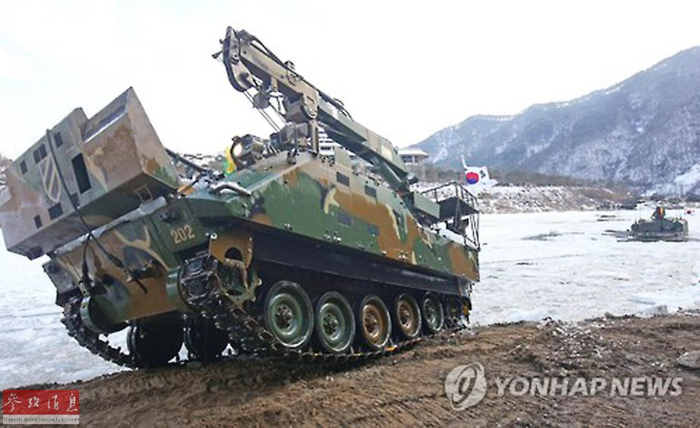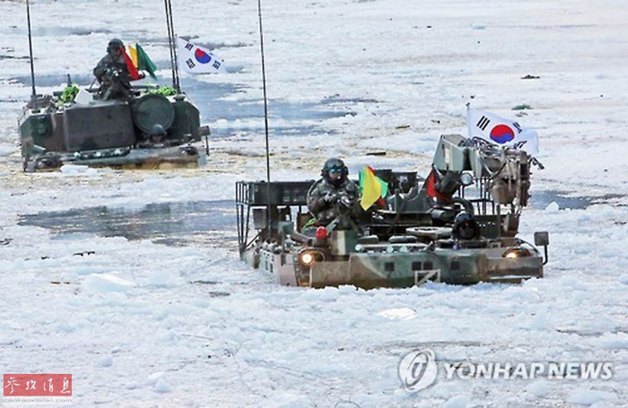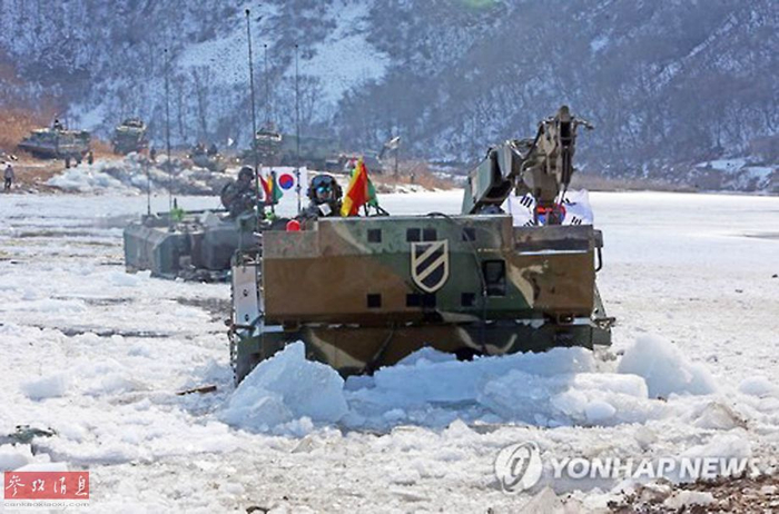 2月上旬,韩国陆军第11机械化步兵师在江原道洪川江一带进行了冬季恶劣气候条件下的破冰渡河训练。