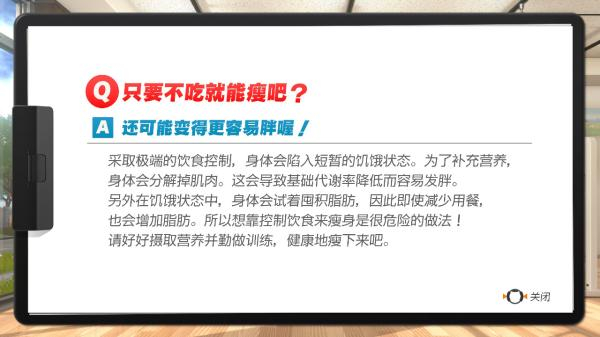 任何一个模式结束锻炼后,游戏会教你放松运动;并会传递一些瘦身知识和瘦身建议,与玩家进行互动。