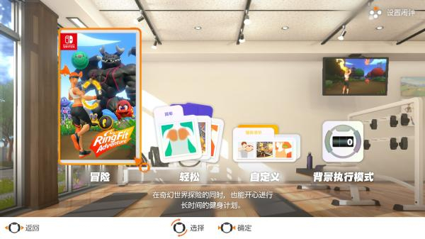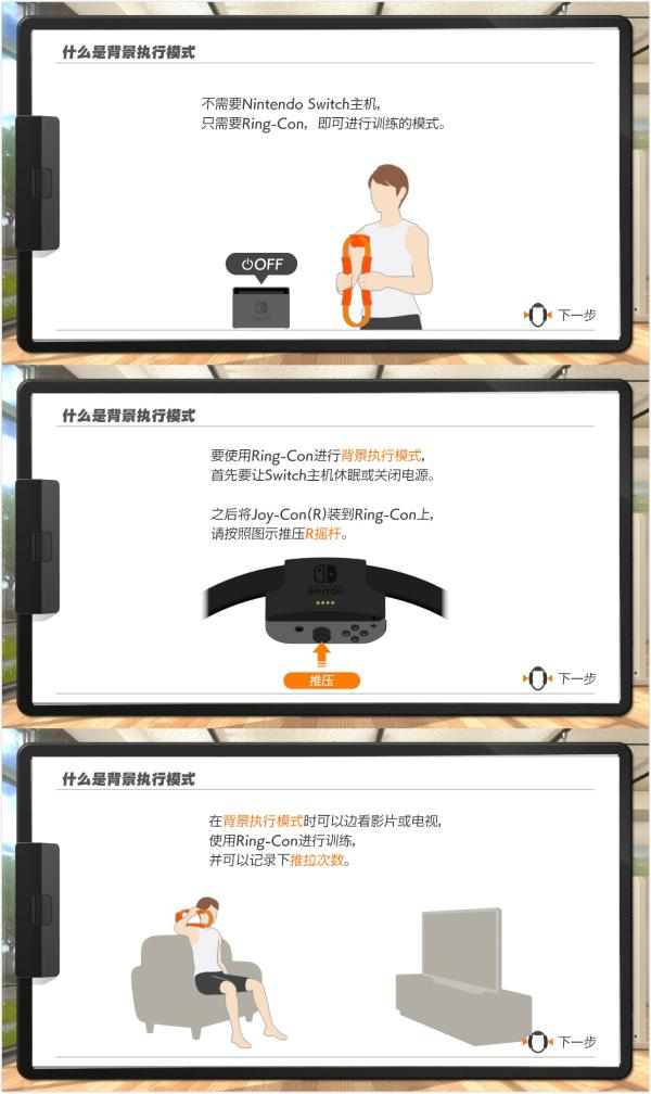 任天堂还为没有时间玩游戏的玩家提供了背景执行模式。该模式下,玩家只需要健身圆环,甚至无需开NS主机。玩家在平时坐着或看电视时,推压R摇杆就可以进行力量训练。健身圆环会帮你记录下运动的次数。