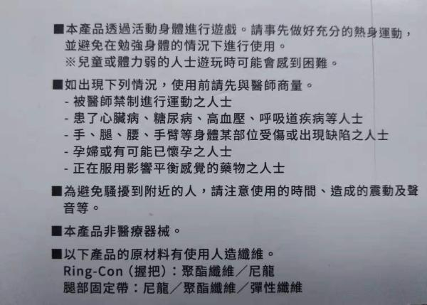 作为一家人性化的公司,任天堂在《健身环大冒险》游戏包装盒上标注了各类提示。玩游戏前请做好热身运动,建议不要在勉强身体的情况下使用。医生禁止运动的人士、有心脏病等各类不适合运动的人士不建议玩耍这款游戏。根据游戏卡带的说明,这款游戏的年龄定位为“6+”。游戏中的虚拟教练也会提示,6岁以上的儿童玩耍时,需要家长陪同。
