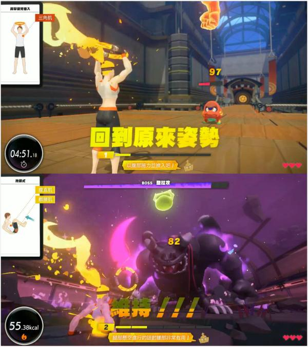 游戏过程中,画面会告诉玩家哪个部位得到了锻炼。 玩家清关后,会获得相应的锻炼点数来提升等级和攻防能力,还能得到新的健身技能。整个冒险模式四大类复杂的健身动作:深蹲、高举双臂、抱膝式、椅子姿势,分别用不同的颜色表示。平常不进行上肢力量训练的笔者,在高举双臂挤压圆环时,还是感觉有点累。