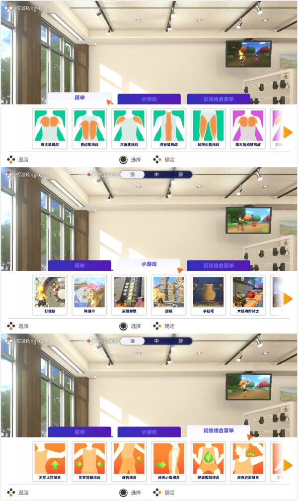 轻松模式分简单、小游戏和训练组合三种模式。时间都在几分钟之内,适合众人玩。小游戏模式包含了打地鼠、深蹲弹跳等12种轻松的小游戏。这个模式下,玩家仅用健身圆环,不需要用上腿部固定带。