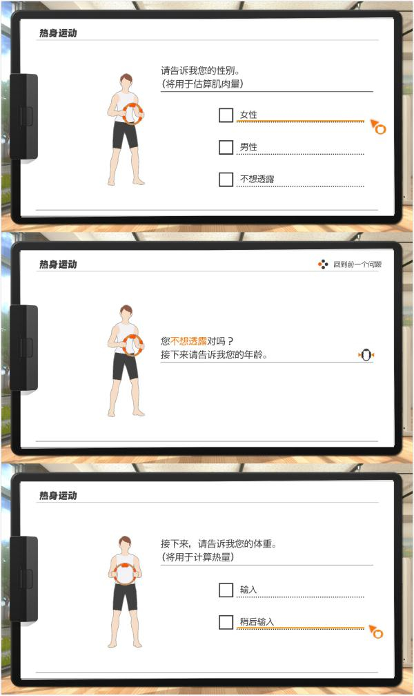 进入游戏后,玩家可以进行账户设置,设置性别、年龄、运动频率、运动喜好等资料。担心影响邻居的玩家,可以在此时切换成静音模式。所有记录的运动状况均由电脑专家进行监督,游戏(运动)开始前和游戏(运动)结束后,玩家把右手拇指放在圆环手柄上的IR摄像头,可以检测出心率、脉搏、消耗热量等数据,帮助玩家了解运动后的效果。