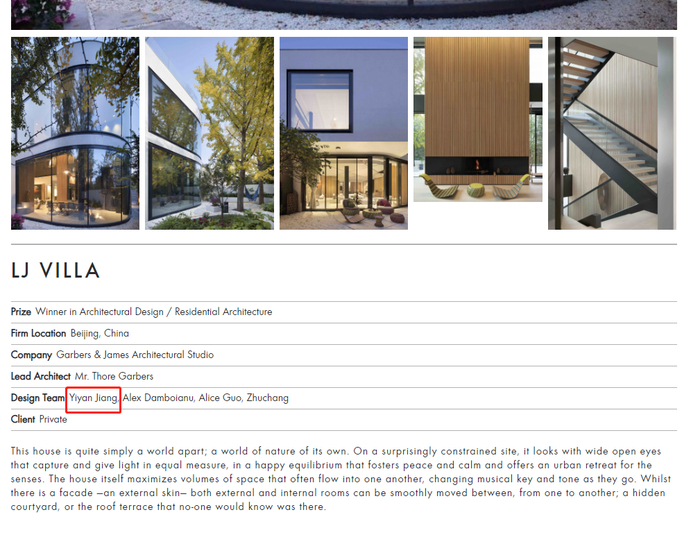 在2018年的获奖名单中,红星新闻记者查询到带有江一燕名字的建筑作品“LJ VILLA”(注:LJ为LOVE JYY VILLA前两个单词的首字母缩写)获奖信息。在获奖信息中,在设计团队一栏中,江一燕的名字排在首位。而首席设计师为德国人Thore Garbers。