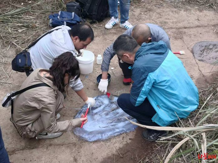 18日上午9点到下午5点,周超一直陪着考察团队,看着团队一点点清理、测量、倒模拓印,他这才相信,原来自己拍到的真是恐龙足迹。