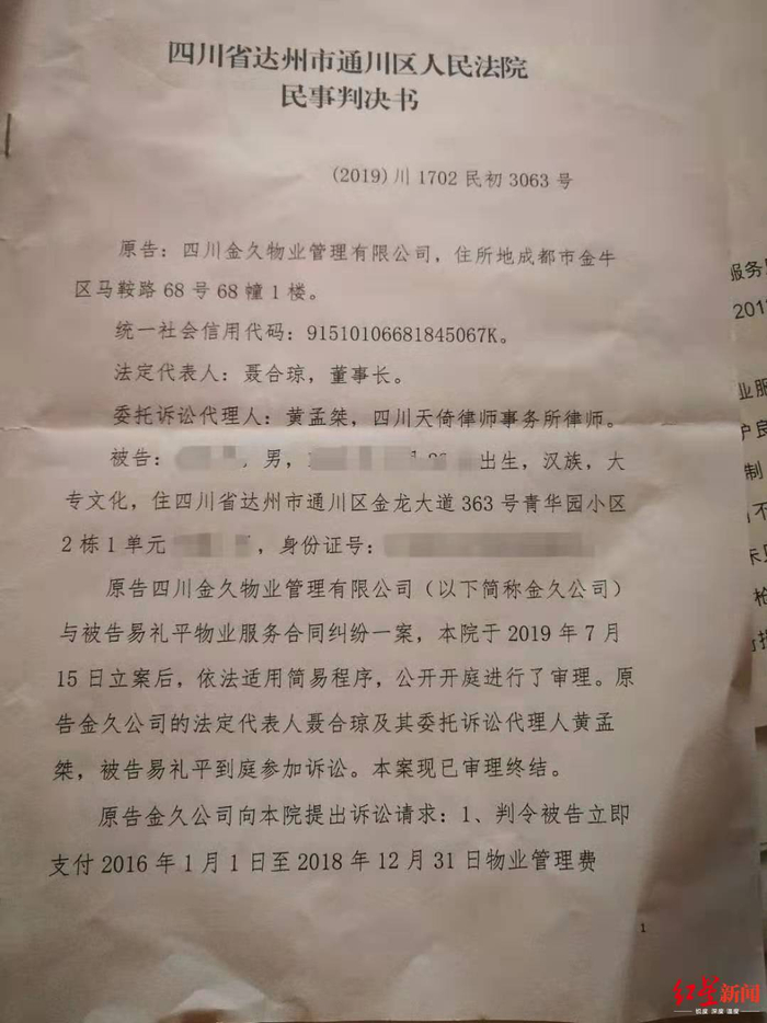 然而在今年在7月底,易先生收到了通川区人民法院的传票,“物业公司告了我们15人不缴物业费”。最后,法院判易先生缴清2016年到2018年底的物业费和代收垃圾清运费3800余元。
