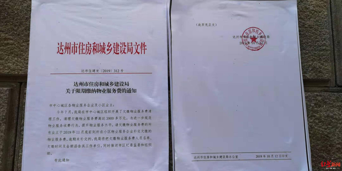 10月12日,达州市住房和城乡建设局文件发出《达州市住房和城乡建设局关于限期缴纳物业服务费的通知》。