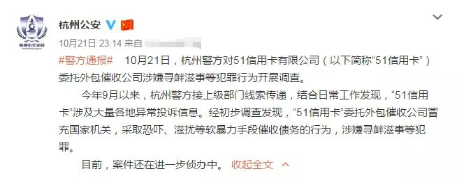 通报微博显示:10月21日,杭州警方对51信用卡有限公司(以下简称“51信用卡”)委托外包催收公司涉嫌寻衅滋事等犯罪行为开展调查。