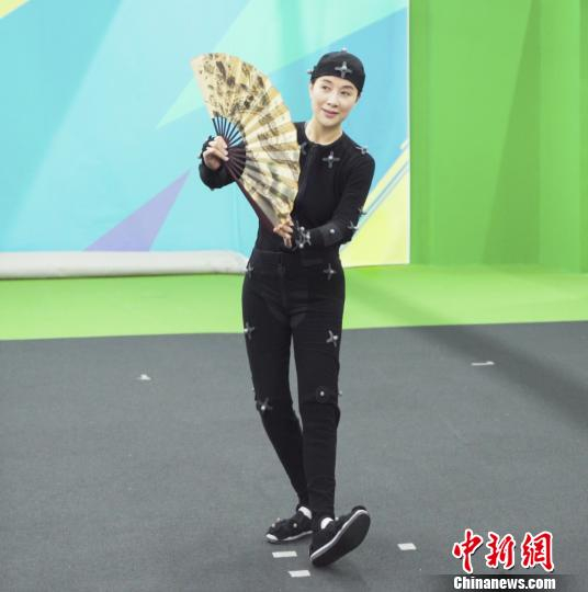茅威涛穿上有光标点的动补服,工作人员借助动态捕捉技术记录下潇洒飘逸的越剧女小生身段。百越文创供图