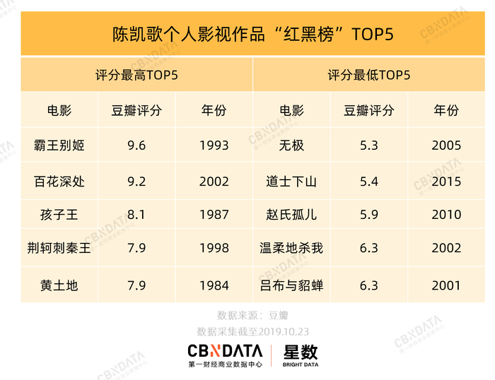 在此,我们也做了一份“陈凯歌电影口碑红黑榜TOP5”,从中可以更清晰的看到他在电影界的“最高峰”和“最低谷”时期。
