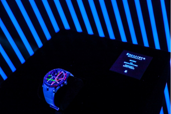 这段非凡旅程继续延伸到一个Blacklight Box空间中,其场景淋漓尽致地体现出品牌桀骜不羁的艺术创意,以点亮最勇往无惧的Roger Dubuis罗杰杜彼爱好者内心的奢华绚丽。在此,巧妙的色彩设计胜过一切。Roger Dubuis罗杰杜彼以其创造美感的超凡能力和处理细节的独特才华打造出展现“广阔无限生命”的完美场景,让仅发行28枚的Excalibur Blacklight限量版表款的彩虹装饰得以在此亮丽闪烁。此款时计将人工培育蓝宝石技术首次应用于高级钟表中,实现了技术与美学的壮举。在四周柔和幽黯环境的衬托下,腕表机芯宛如一件真实的3D机械雕塑作品,蓝宝石在紫外线下发光的能力更增强了这种立体感,并使得精妙设计的机芯仿佛于夜间在表壳中漂浮。此表款运用混合材质展现独特而具现代感的设计,化身为承载着精湛内涵的完美机械艺术品。