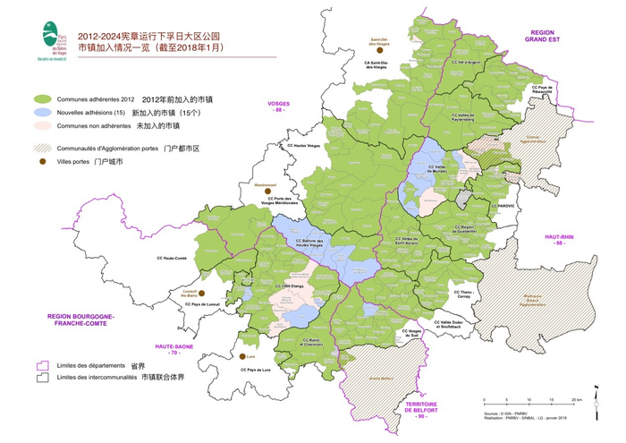 孚日大区自然公园市镇加入情况示意图(2018年1月更新),资料来源:https://www.parc-ballons-vosges.fr/