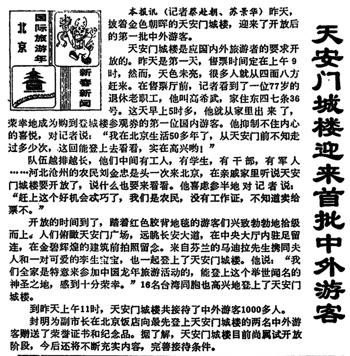 对外开放头一个月,天安门城楼就接待了国内外游客4万多人,其中85%是国内游客。这个令人激动的大事件入选了当年的二十大新闻。(1988年2月1日《北京日报》1版,《天安门城楼接待国内外游客四万》)