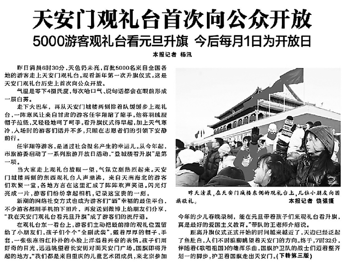 2012年元旦,首批5000名来自全国各地的游客走上天安门观礼台,观看新年第一次升旗仪式。这是天安门观礼台历史上首次向公众开放。(2012年1月2日《北京日报》1版,《天安门观礼台首次向公众开放》)