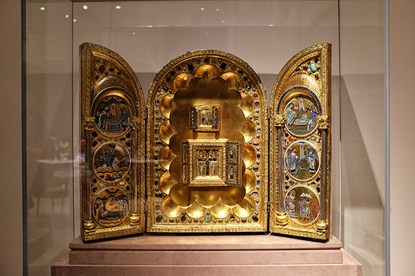 中庭的灯光照亮了两件嵌着宝石的中世纪黄金神龛,人们在为它们惊叹后,走向中庭连接的三栋建筑。这三栋建筑的历史比中庭更老,分别是摩根家族的两栋故居,以及J.P.摩根于20世纪初委托建筑师查尔斯·马吉姆(Charles McKim)设计的私人图书馆。