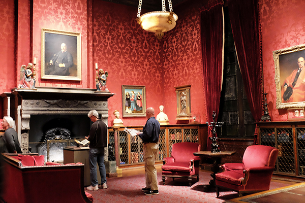 J.P.摩根的书房是整栋建筑里最奢丽的房间,古董木屋顶来自意大利,地板上铺着厚重的红色地毯,红色带暗花的墙面与深红的天鹅绒窗帘、红丝绒沙发互相映衬。