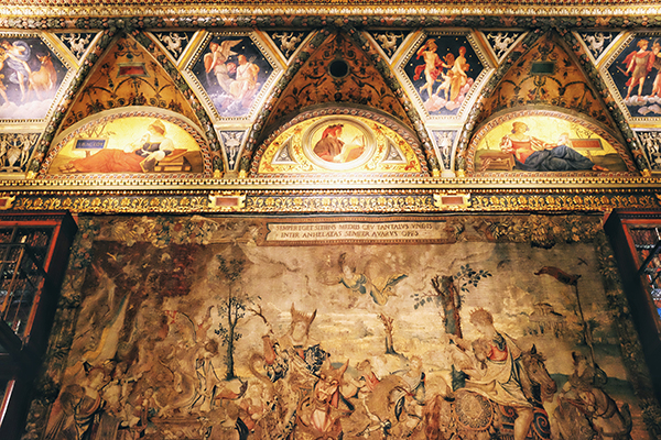 天花板的灵感,来自文艺复兴时期意大利画家平图里乔和巴达萨尔·佩鲁齐在罗马创作的壁画。连接墙面与天花板的半月形弧面,有着耀眼的鎏金装饰,绘制着9位缪斯女神与深受她们启迪的人物,包括哲学家苏格拉底、画家波提切利、天文学家伽利略、航海家哥伦布等等。