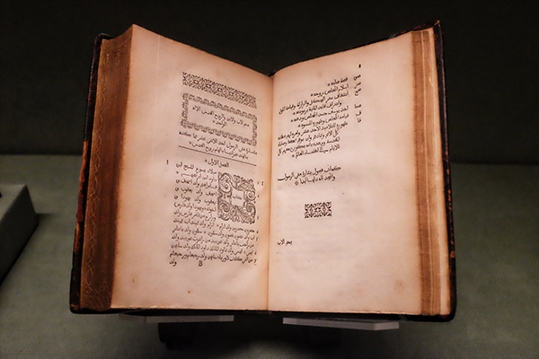 除了古腾堡《圣经》,我还看见了另外两本特别的《圣经》。一本是以黄金浮雕外壳作为封面的福音书,围绕着十字架上的耶稣镶嵌有华丽的宝石,显露出中世纪虔诚的宗教情感。另一本则是16世纪时翻译成阿拉伯文的《新约》。和同时期的手抄本或印刷本不同,书页里没有人物形象的插图,而使用了中东风情的花纹和书法作为装饰。