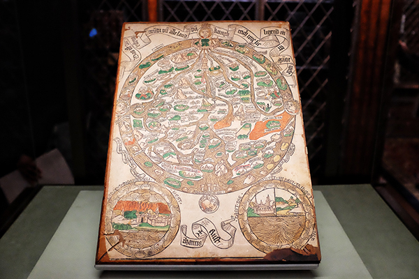 不止是《圣经》,藏书室里还有16世纪一位女性书法家用镜面文字手写的信件、世界上最古老的雕版印刷乐谱、以及最早的木刻世界地图的唯一抄本——制作于15世纪,按照中世纪的习惯将耶路撒冷置于世界中心,而伊甸园位于顶部、地中海位于底部。