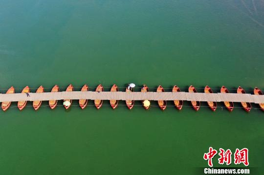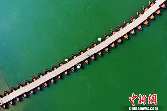 游客行走在江西省铅山县河口镇信江之上的浮桥。 刘占昆 摄