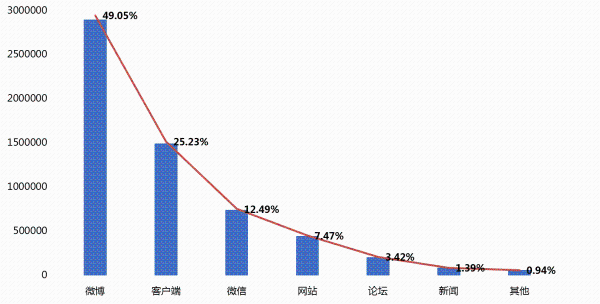 在信息传播渠道上,“消费维权”类信息传播主要有微博、客户端、微信、网站、论坛、新闻等渠道。其中,微博信息量最高,占比49.05%;客户端信息量占比25.23%;微信信息量占比12.49%。(见图2)