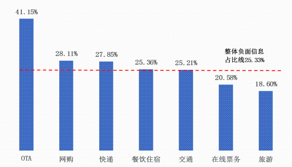 在各行业“消费维权”类信息中,OTA平台、网络购物、快递服务和餐饮住宿的负面信息占比较整体负面信息占比偏高,其中OTA平台负面信息占比最高,为41.15%,高出整体15.82%;交通出行、在线票务和旅游消费负面信息占比与“消费维权”整体负面信息占比(25.33%)相比基本持平或偏低。(见图5)