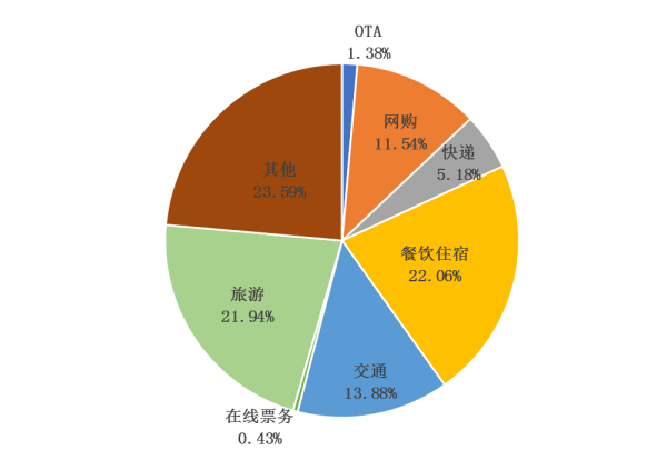监测期内,“消费维权”类信息集中在餐饮住宿、旅游、交通出行、网络购物、快递、OTA和在线票务等行业领域。其中餐饮住宿和旅游消费的信息占比超过20%,分别为22.06%和21.94%。(见图4)