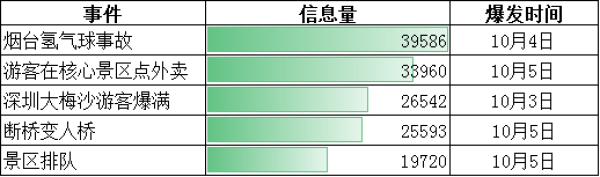 10月1日,烟台马家沟景区一氢气球绳子断裂飞向空中。气球上升时发生破裂,氢气球上的一对母子从空中坠到地面后死亡。该事件信息量共39586条,占比3.06%。