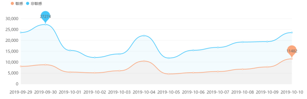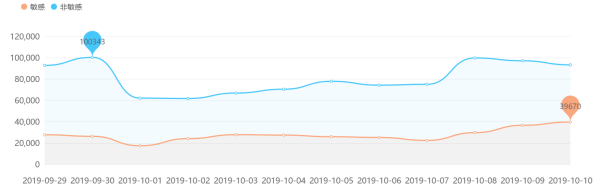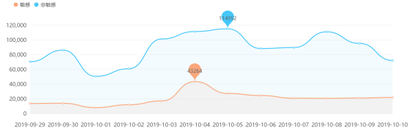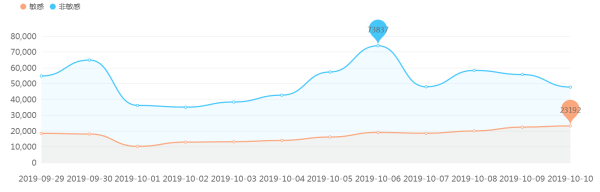 监测期内,共收到餐饮住宿相关消费维权信息1297735条,其中负面信息329132条。从日趋势图看,餐饮住宿的负面信息在10月7日前呈现出较为平稳的趋势,10月7日后呈现增长趋势,并在10月10日达到峰值39670条。(见图14)