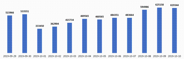 在9月29日—10月10日共计12天的监测期内,共收集“消费维权”类信息5899238条,日均信息量491603条。整个监测期间内,“消费维权”信息呈现出两头高中间低走势,10月1日最少,共收集信息333450条。在10月1日之后,“消费维权”类信息呈现出增长趋势,并在节后稳定在每日60万条左右。(见图1)