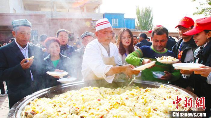 阿瓦提县准备的可供500人食用的大锅抓饭围满了等待品尝的人。 王小军 摄