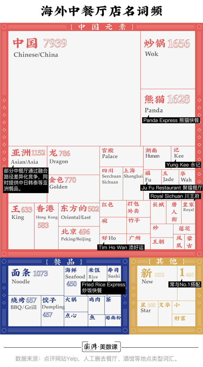 与中国国内五花八门甚至颇有网感的名字不同,海外中餐厅的名字实在有点“土”。除了直译的中餐厅(Chinese/China Restaurant),从炒锅到饺子,从熊猫到竹子,从金色到北京,无一不在提醒食客,这是一家来自遥远东方神秘国度的餐厅。