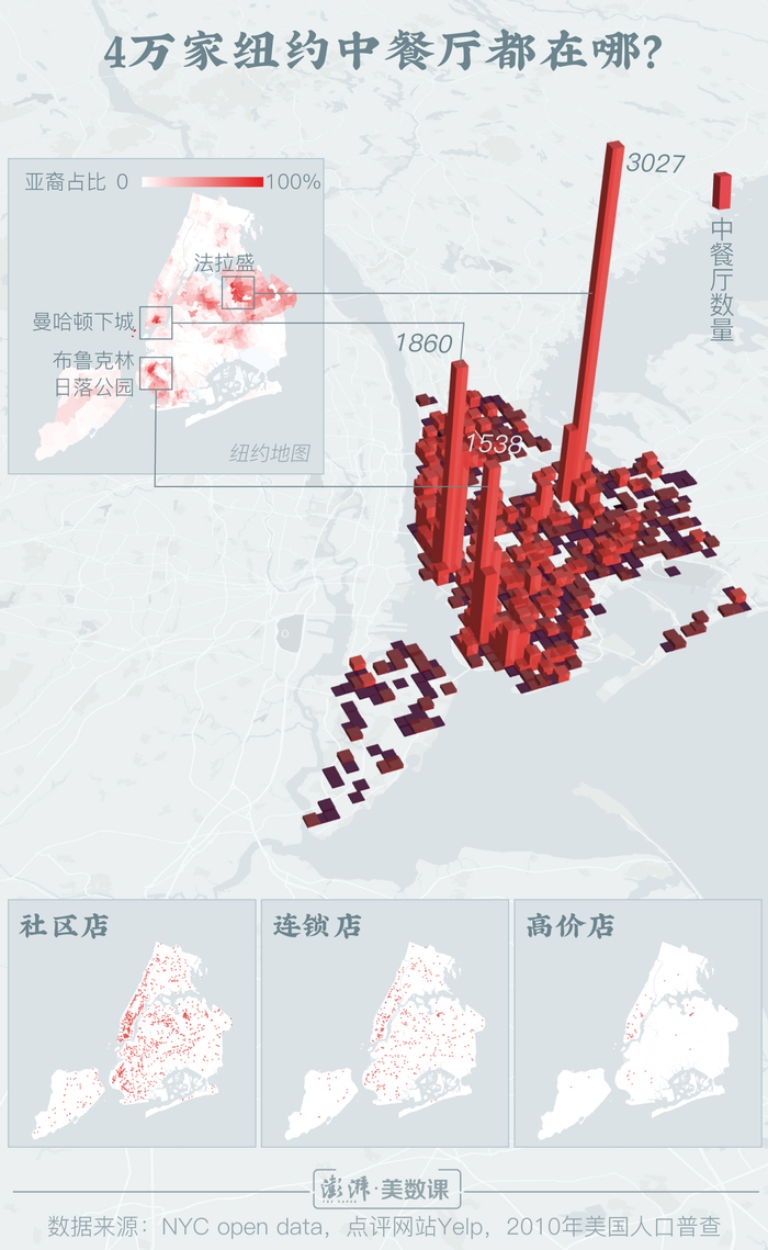 国际都市纽约拥有4万多家中餐厅,曼哈顿下城和法拉盛的唐人街自然吸引了不少餐厅落址,但从NYC的公开数据来看,中餐厅早已散布在纽约的大街小巷,可以说有人的地方就有中餐厅。