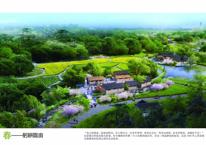 澎湃新闻注意到,一同公布的卧龙岗景观方案效果图包括“躬耕陇亩”——以诸葛亮所做农歌为意境,松竹掩映间布置一片小而精的陇亩田,农舍三两成群依溪而设,还原1800年之前诸葛亮躬耕南阳怡然自得的生活场景等。
