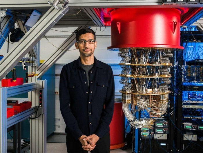 ▲谷歌CEO桑德尔·皮查伊与圣巴巴拉实验室内的量子计算器。图源:法新社