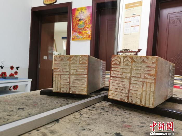 今年58岁的陈新恒是南漳县财政局一名干部,也是一名书法、篆刻爱好者。记者25日在陈新恒的家中见到了这枚巨型印章。两人合抱,才将它从“家庭档案馆”移到客厅工作台上。