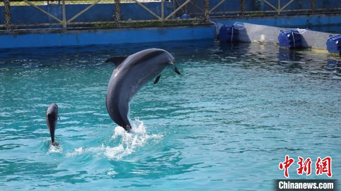 图为小海豚跟着海豚妈妈“亚亚”练习跳跃。三亚海昌供图 王晓斌 摄