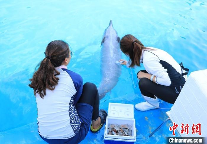 图为在分娩前,兽医给母海豚做孕前B超检查。三亚海昌供图 王晓斌 摄