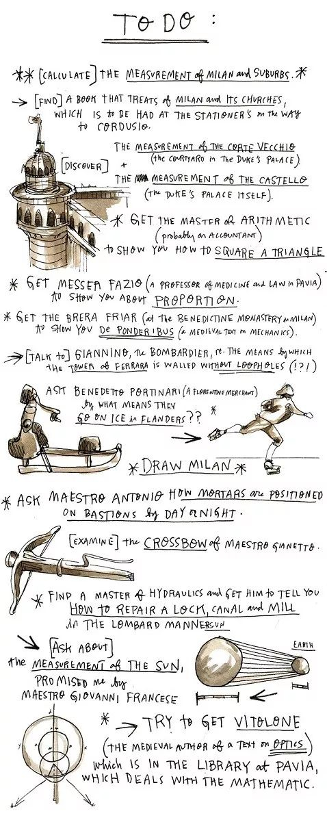 他的手记里不仅记录了各种发现、猜想和设计草图,还有个很有意思的版块 —— 任务清单。