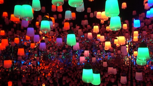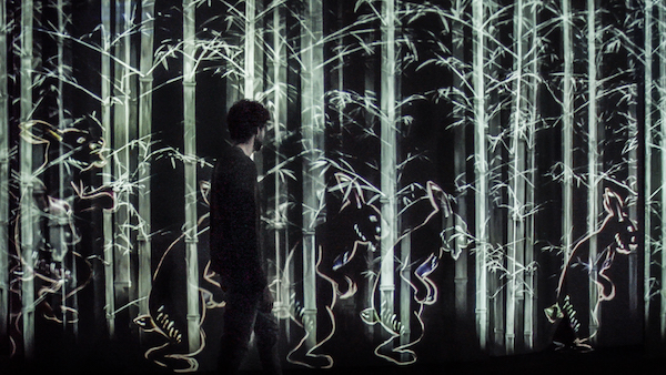 在《被追逐的八咫乌,追逐同时亦被追逐着的八咫乌——超越空间》中,为例,以光描绘的八咫鸟群纷纷起飞,在穿越复杂的时空之后,最终幻化为花朵消散。《超越边界的群蝶》是一件互动作品,人们对屏幕的触碰既能生出蝴蝶,也能让其死亡,从这里“飞”出的蝴蝶还会飞向各个展厅,如同没有边界的自然一样。在《地形的记忆》中,人们可以穿过一片如同梯田一般有高低起伏的场地,身边则是如同荷叶一般铺展开来的圆片。这里的场景会跟随一年四季的特征而变换,春天来时会有樱花,冬天则会看见飞雪。