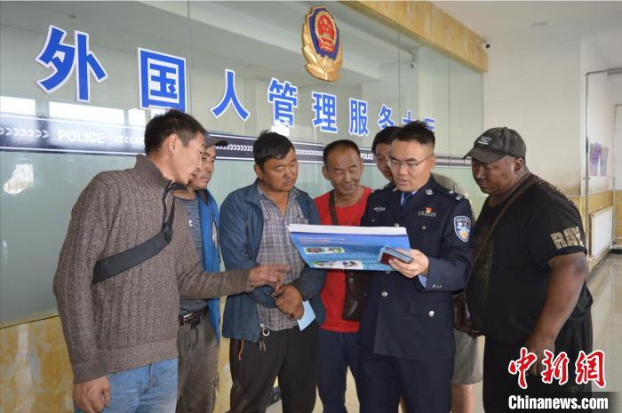 图为黄健在向蒙古国籍人员讲解法律法规。巴彦淖尔边境管理支队供图。