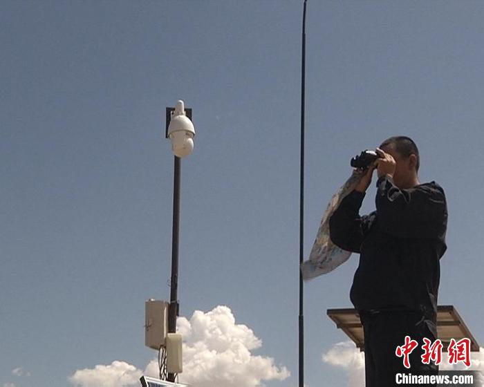 护边员杨东巡边时用望远镜瞭望远处。巴彦淖尔边境管理支队供图。