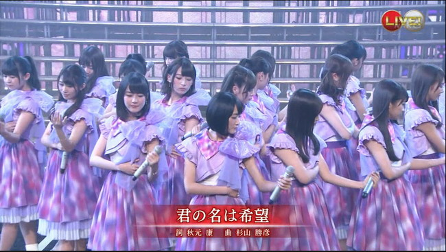 而在具体的歌曲演出中,迎合中国粉丝的“本土化”色彩同样随处可见。观众们在现场看到“乃木坂46”的成员手持扇子,上半身近似旗袍的穿着。严格的说,早在2015年的日本红白歌会上,六位“乃木坂46”成员就身穿旗袍手持扇子为歌手伴舞过,但在演唱会上以这样的装束演唱歌曲,恐怕还是第一次。甚至一首对于“乃木坂46”而言意义非同寻常的歌曲,2015年红白歌会初登场时演唱的《你的名字是希望》,在星期五的晚上也给了现场观众一个绝大的惊喜——其歌词是用中文唱的!当舞台后面的大屏幕打出了精心翻译的中文歌词后,整个“梅-奔”毫无预兆地响起了一片欢腾。