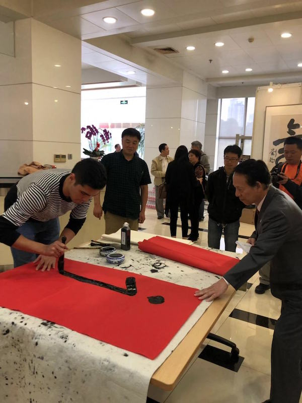 来自吉尔吉斯斯坦的刘阳现场表演了大字书写的“福”字,他喜欢写大字,充满雄强之气,他说:“我来到中国四年了,两年前曾经有机会去参观了次书法展览。当时看到了不少书法作品,虽然对内容还不是太理解,但是有不少书法作品给我一种磅薄的气势,从字里行间我好像感受到了书法家当时的心情。当时我就觉得书法有一种神奇的魅力,这也激起了我想学习中文的兴趣和决心。在一年多的学习中,我克服了不少困难,从刚开始对中文的不了解,到现在会写会用,基本克服了语言障碍。书法还可以锻炼我的专注力,可以让我在很长一段时间内静下心来,专心做一件事。所以我一直坚持练习书法,没有放弃。书法的乐趣不仅仅在于我目前所得到的成果,而是在于学习时不断进步的过程。我看着自己的书法水平有所长进,感受到快乐的同时,对中国文化的了解也在不断增加。我希望有一天,别人通过我的作品,也可以体会到中国文化的博大精深。”