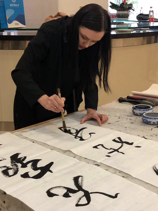 来自乌克兰的安好学习书法的时间可算是最长的,她学习书法至今已有两年时间,她说因为以前学习过音乐指挥,很喜欢草书的节奏感与韵律感,杨建文教授因人施教,让她主要学习《书谱》的用笔,她感觉学习指挥时手腕运行的线路和书法中间的“八面用锋”有十分相似的地方。
