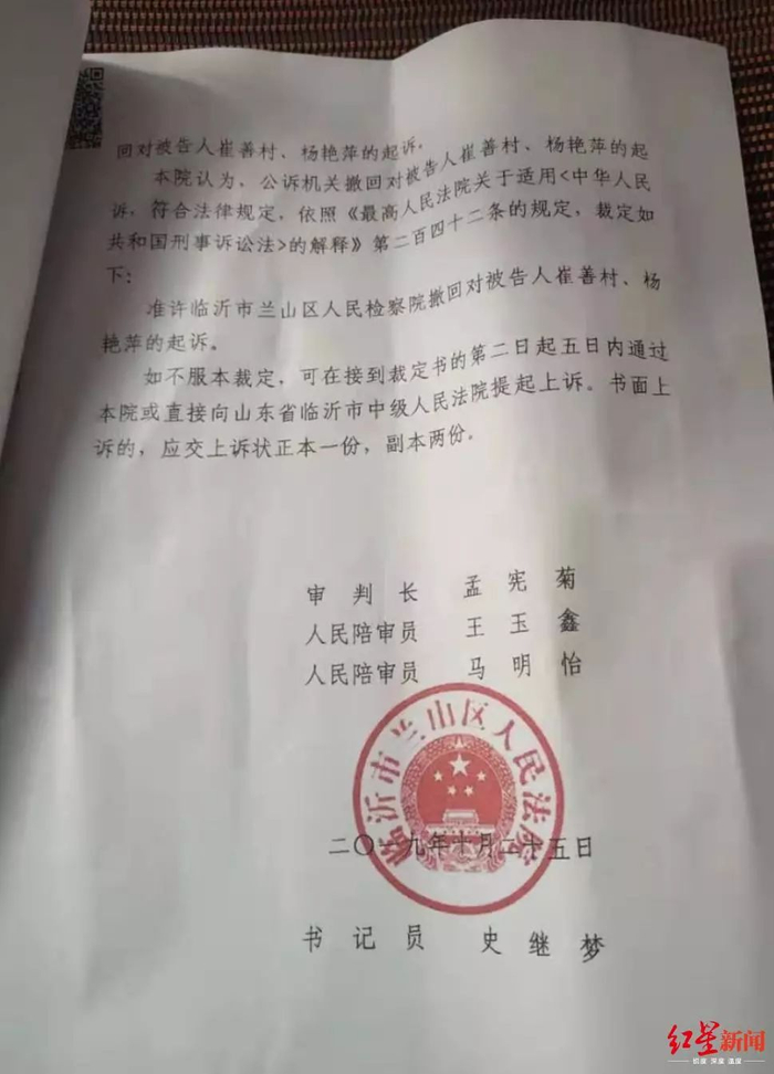 2019年10月26日,红星新闻记者从兰山区人民法院《刑事裁定书》了解到,兰山区检察院以本案证据发生变化为由,决定撤回对崔善村夫妇的起诉,2019年10月25日,法院作出裁定,准许检方撤诉。