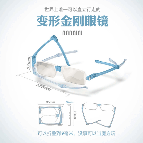 和传统眼镜相比,纳尼尼系列老花镜显得格外时尚轻便。该产品的镜片、镜架、镜腿等每个部位都可以实现360度的旋转和折叠,最薄可折叠至9毫米,重量仅为13克左右,可轻松放入牛仔裤口袋中,而价格只有300多元。