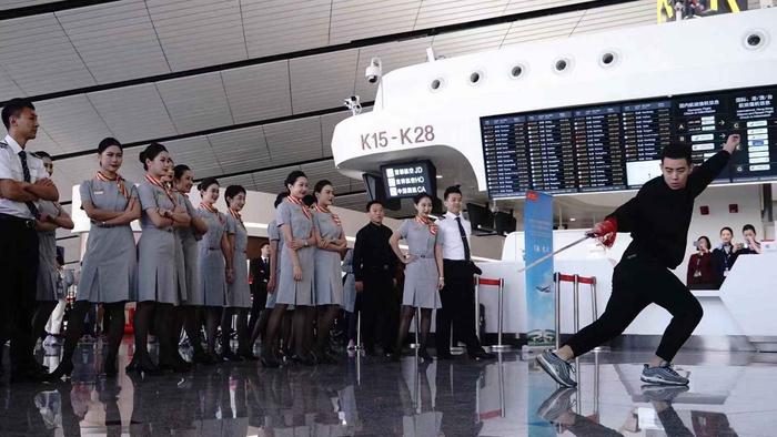 今晨8时16分,首都航空一架A320飞机执行JD5315航班,从北京大兴国际机场腾空而起,飞往鸡西兴凯湖机场,这是首都航空当天从大兴机场出港的首个航班。上午9时30分,一曲《我和我的祖国》小提琴演奏结束后,30余名首都航空飞行员、乘务员、安全员齐刷刷出现在大兴机场4层值机大厅,来了一次“欢庆首航,舞动大兴”主题快闪。优美的中国风表演和动感的流行舞蹈融合拉丁、武术元素,吸引众多旅客驻足观看。