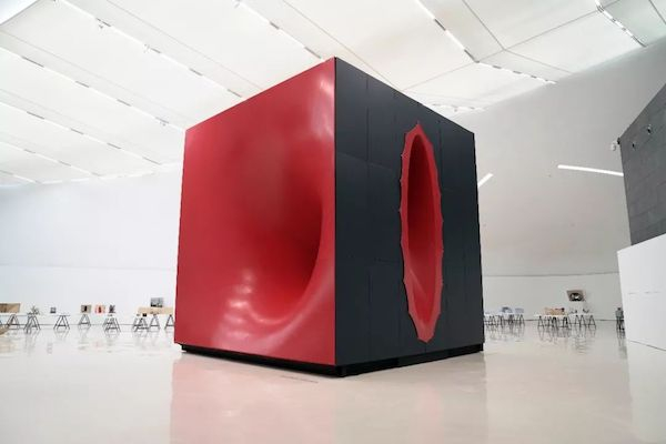 美术馆三层则展出卡普尔在2015年法国凡尔赛宫个人展览首秀的创作《将成为奇特单细胞的截面体》(2015)。卡普尔不仅给观者呈现了生物形态设计,并一同邀请他们通过侧面隐蔽的门进入作品内部,探索装置内部与外部之间的几何空间关系。鲜红的洞被神秘地连接在了一起,形成了一张关于躯体、存在的网。